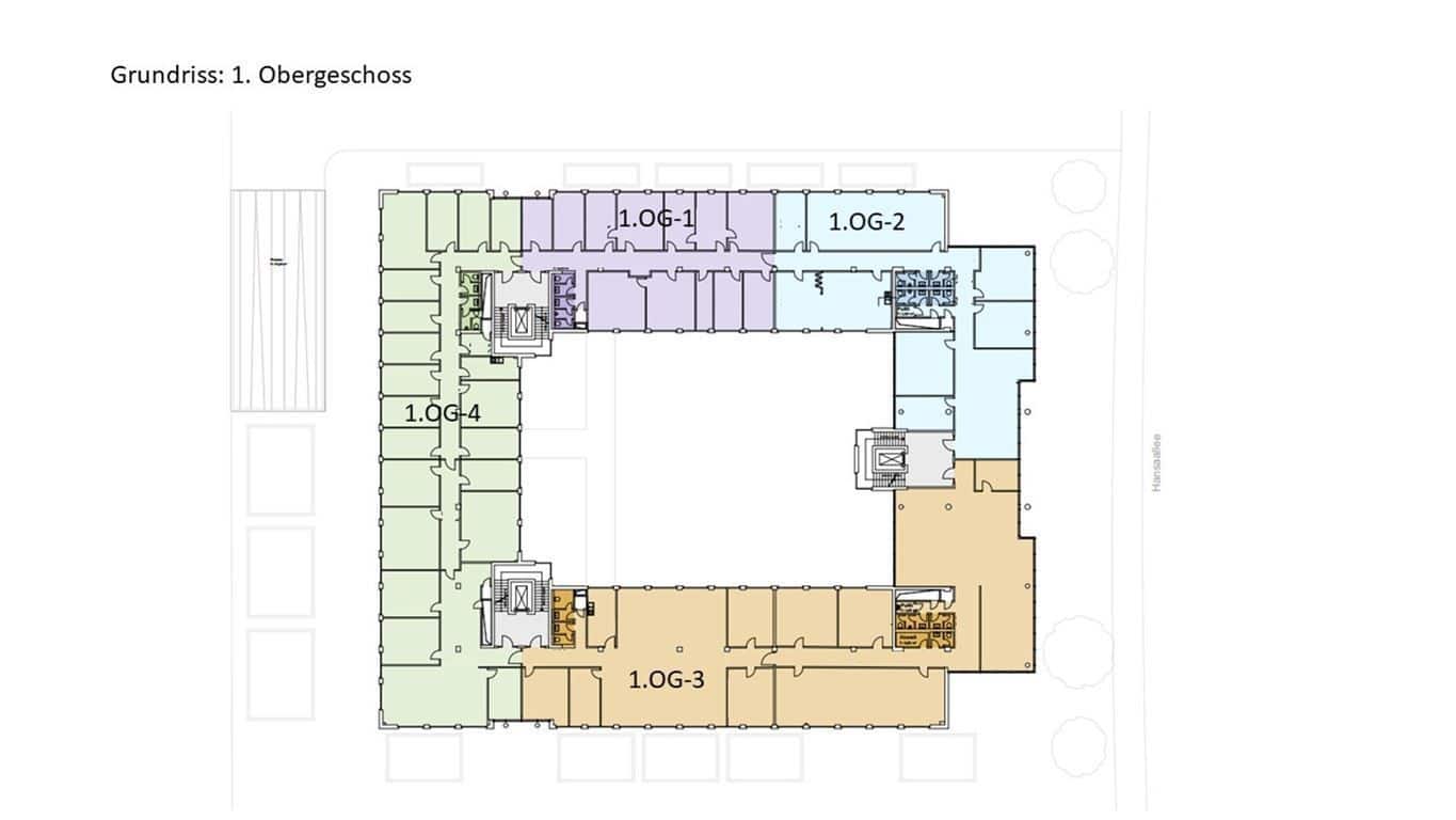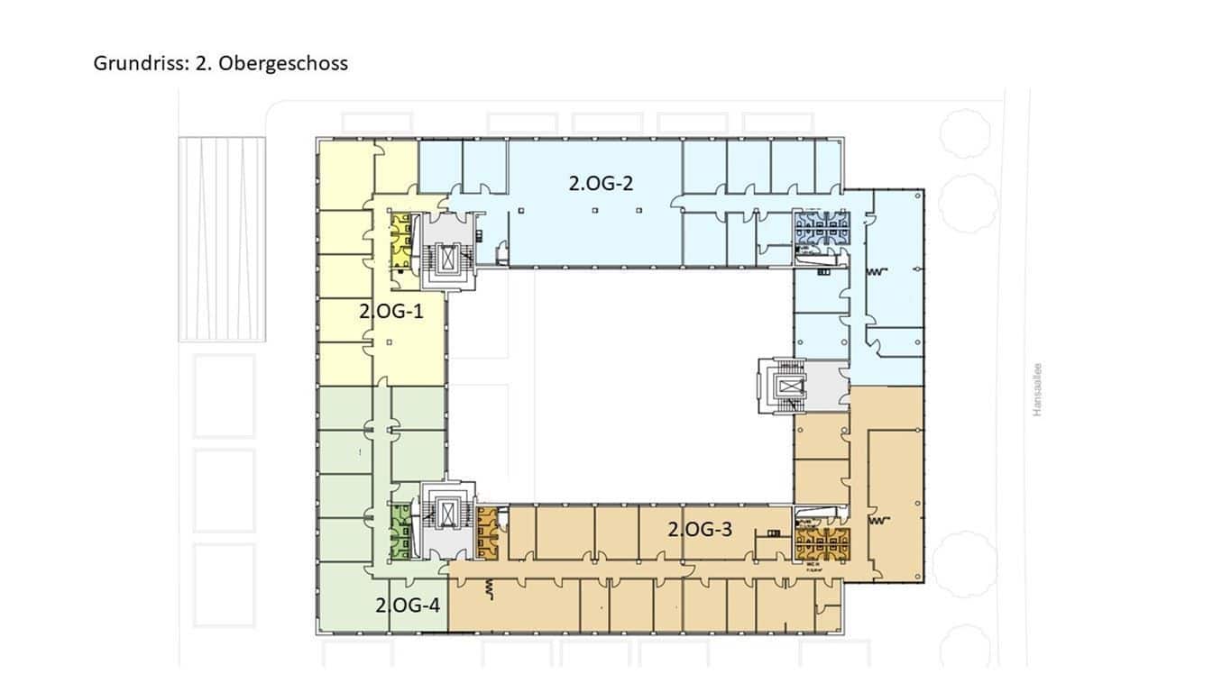Im 2.OG stehen aktuell 1) 291,72 m² & 2) 738,08 m² zur Verfügung.