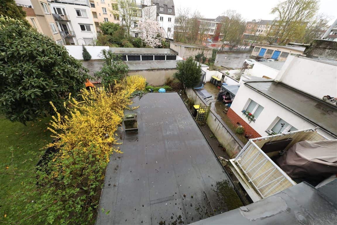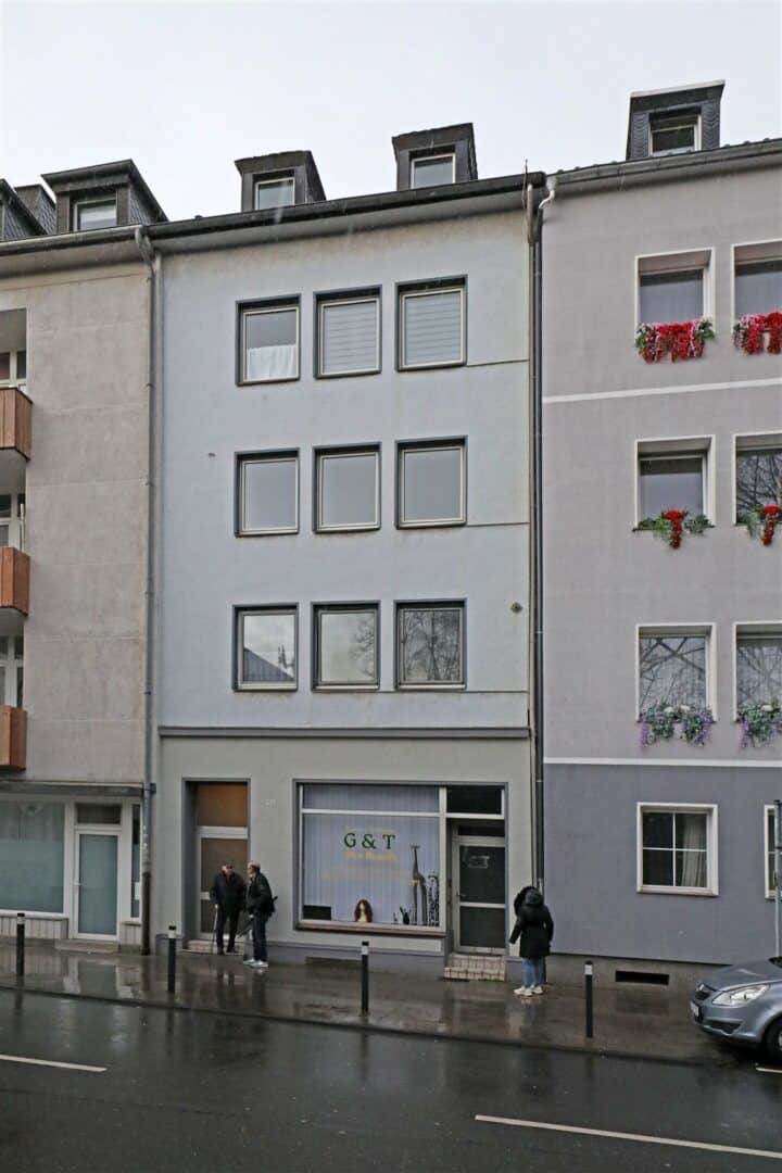Das 4-geschossige Gebäude beherbergt insgesamt 4 Wohnungen und eine kleine Gewerbeeinheit im EG (Friseur). Es wurde im Jahre 1955 in Vollunterkellerung vollständig neu errichtet, nachdem es im 2. Weltkrieg zerstört wurde. Auf jeder Etage befindet sich jeweils eine 2 Zi.-Wohnung mit Balkon. Die Grundrisse sind mit knapp 58m² Wohnfläche identisch. Dies gilt auch für das vermietete Dachgeschoss, wobei die Wohnfläche hier aufgrund der Dachschrägen mit ca. 49m² zu Buche schlägt.