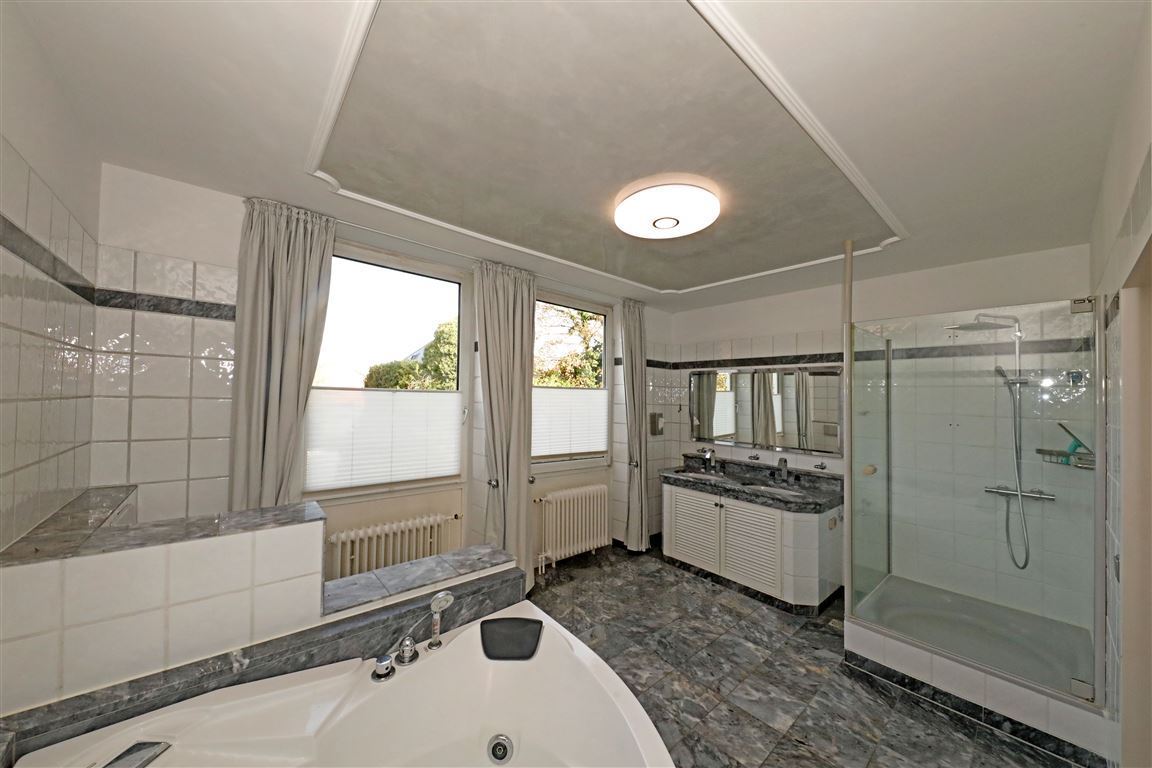 Das großzügige Badezimmer überzeugt durch ein Doppelwaschbecken, eine Badewanne, eine Dusche und zwei große, lichtdurchflutete Fenster.