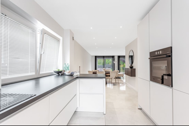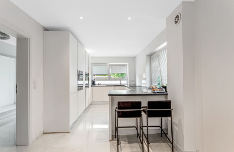 Das Herzstück des Hauses ist der großzügige Wohn- und Essbereich, lichtdurchflutet durch große Fensterfronten, die den Blick ins Grüne freigeben. Hier lässt sich der Alltag vergessen: Morgens duftet der Kaffee auf der Terrasse, abends genießt man den Sonnenuntergang mit Familie und Freunden.Raum für Lebensträume