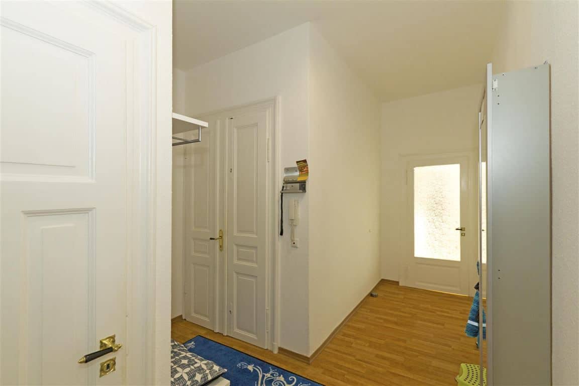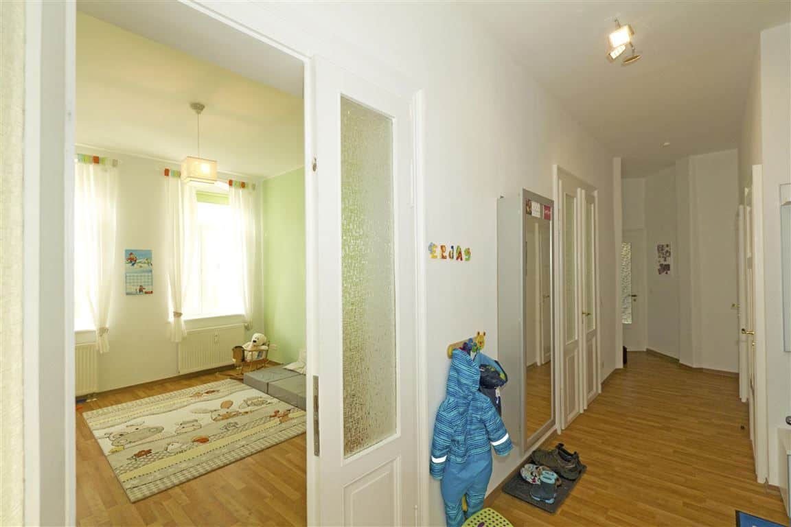 Alle Zimmer sind lichtdurchflutet. Das Elternschlafzimmer der Wohnung befindet sich an der Rückseite und hat einen großen Balkon mit Blick in den Garten. Die Wohnung wurde aufwendig saniert.