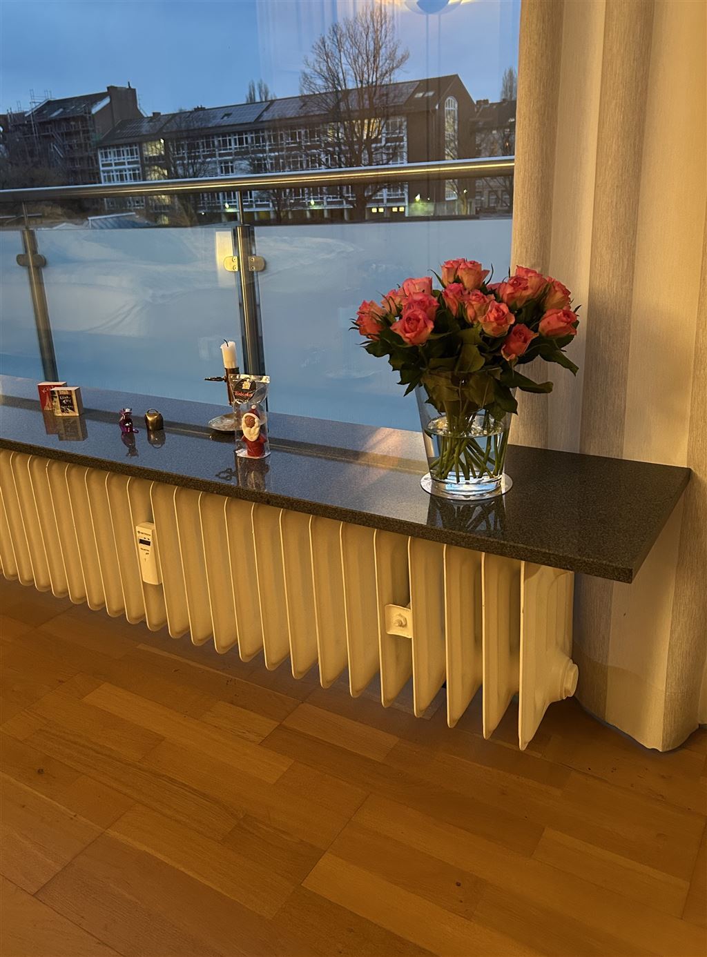 Die nordausgerichtete Fensterfront sorgt für helle, freundliche Lichtverhältnisse, ohne dass sich die Räume im Sommer übermäßig aufheizen. Eine Heizungsablage aus Naturstein unterstützt im Winter ein behagliches Raumklima. Ein kleiner Balkon mit Blick in den ruhigen Innenhof lädt zum Entspannen ein.