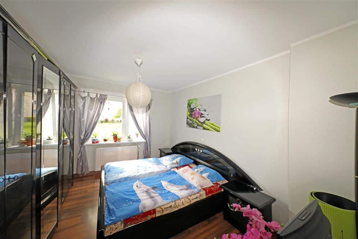 Fliesen im Bad, Laminat in allen übrigen Wohnräumen, Einbauküche und große Fenster zum Balkon, Kellerraum, Fahrradraum, Gartennutzung.