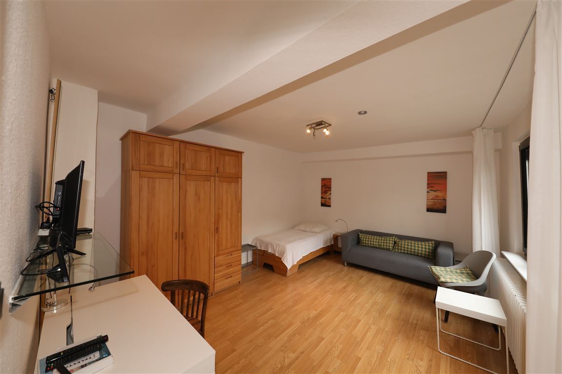 Das Zimmer ist lichtdurchflutet. Die Wohnung hat eine Süd-West-Terrasse und ist MÖBLIERT. Die Ausstattung beinhaltet alles, was man zum täglichen Gebrauch benötigt! Waschmaschine mit Münzautomat, Föhn, Bügelbrett sowie Küchenutensilien. Sie befindet sich in der Nähe einer der attraktivsten Düsseldorfer Einkaufsstraßen.