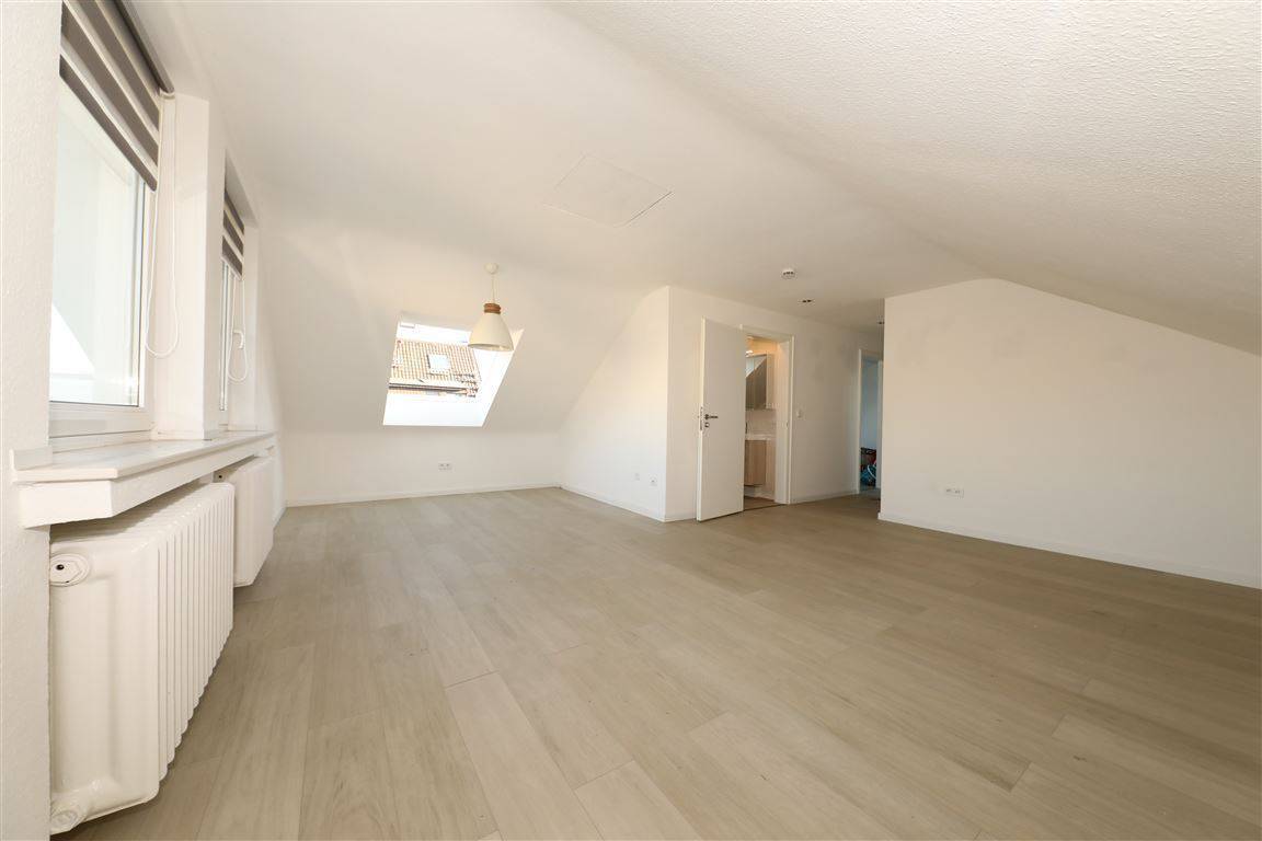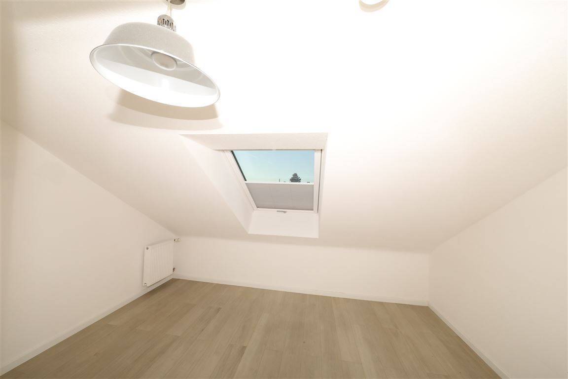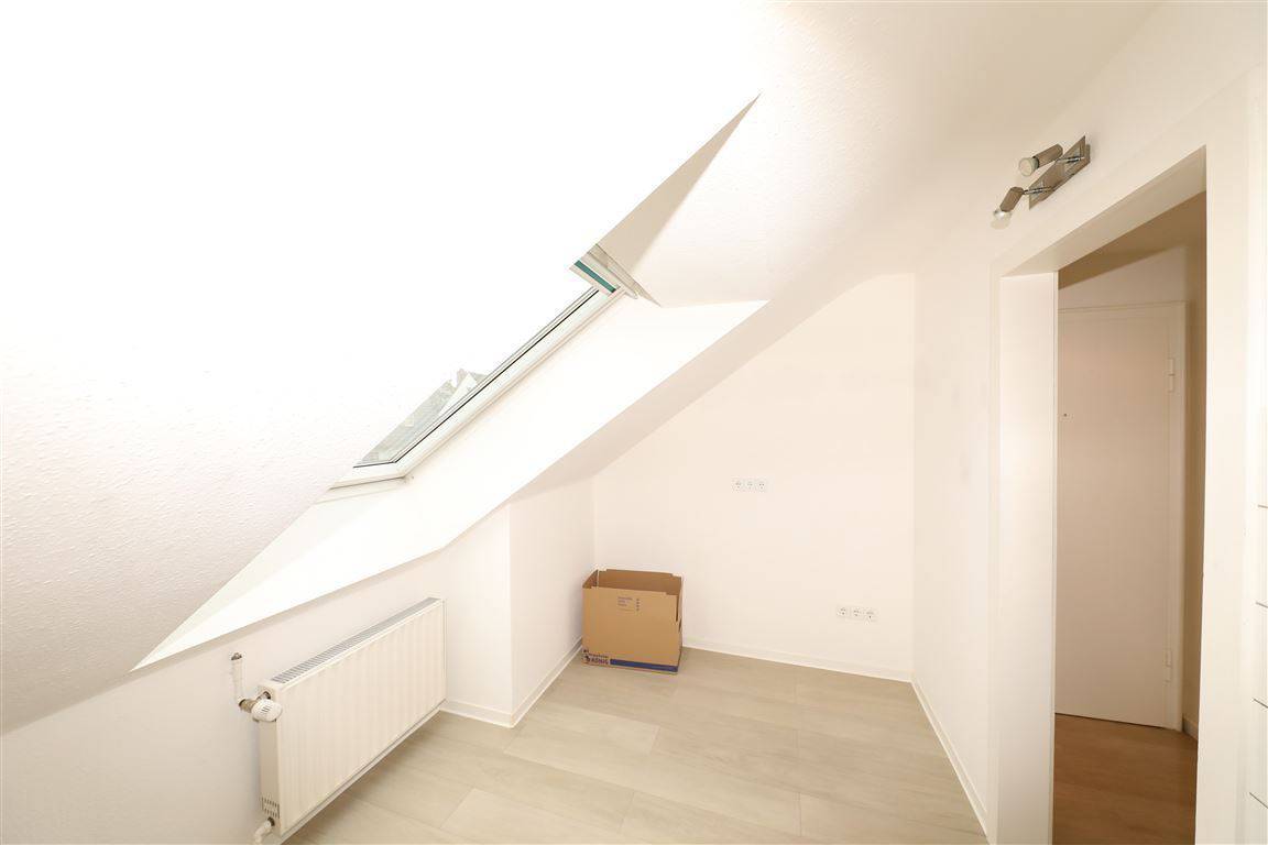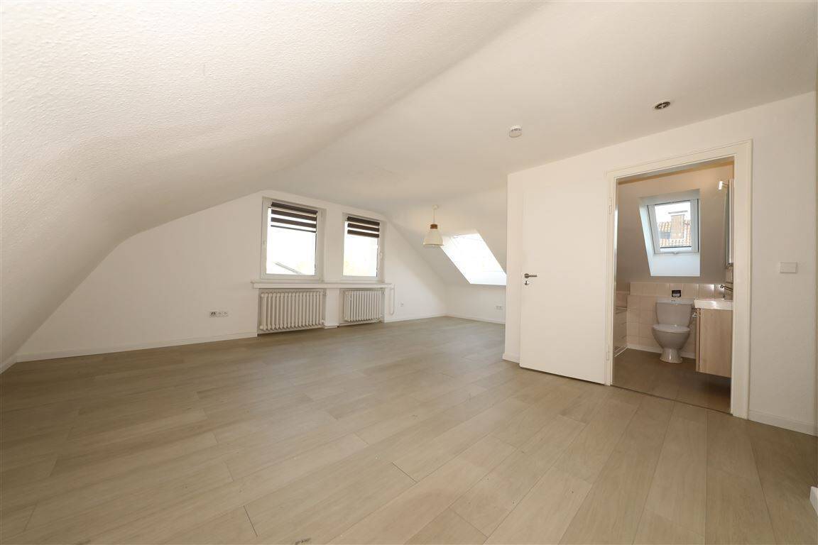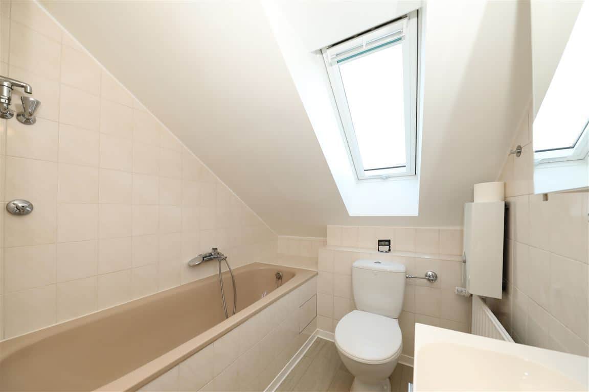 Das helle Badezimmer ist mit einer Wanne, Toilette Dachfenster und hellen Fliesen ausgestattet. In der Küche befindet sich keine Einbauküche.